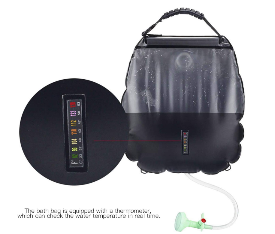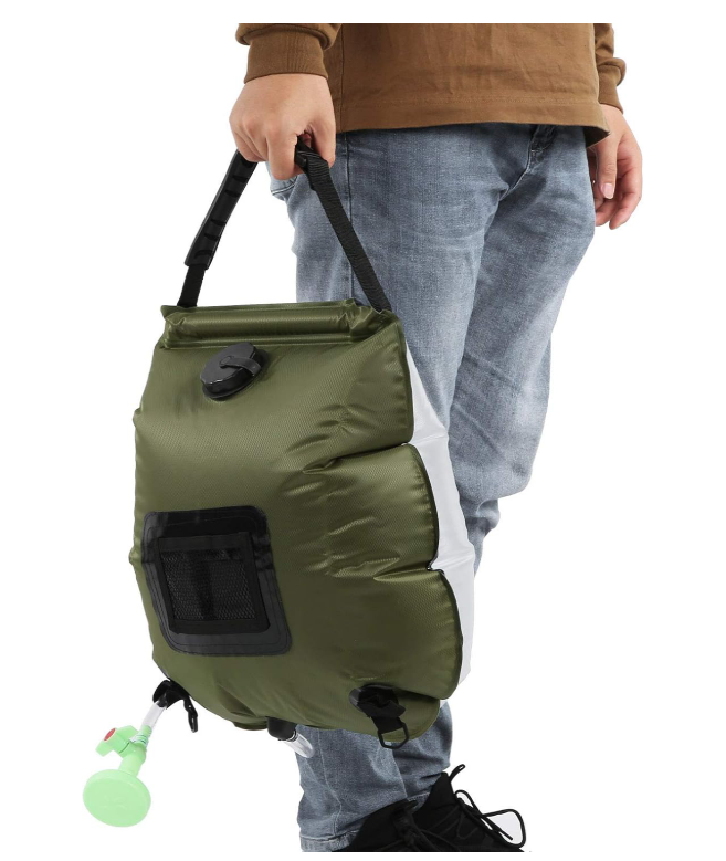 Producto: Ducha solar portátil ideal para acampadas, playa o excursiones al aire libre. Se calienta con la energía solar y ofrece una forma práctica de ducharte o lavar utensilios durante tus aventuras.